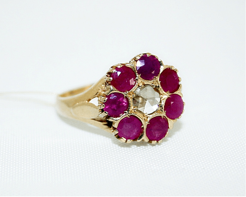Bague En Or 18k Et Argent Style Ancien Avec Au Milieu Un Rubis Et Diamants